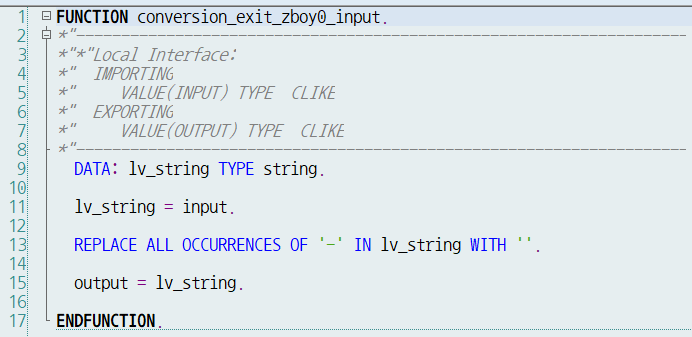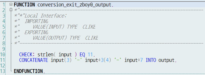 명명 규칙은 CONVERSION_EXIT_컨버전명_INPUT 과 CONVERSION_EXIT_컨버전명_OUTPUT 입니다.